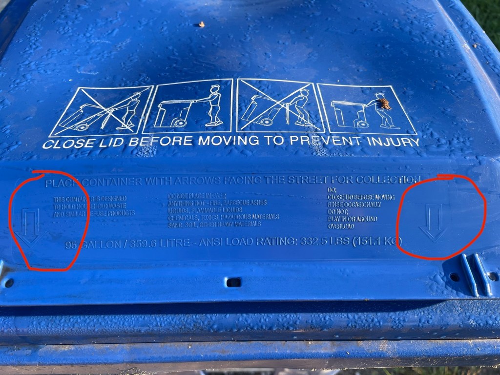 - Carts should open towards the street. Do not place your carts sideways or backwards at the curb. The lids should always open towards the street to prevent damage to the lid/cart. The arrows on the lid should always point toward the street as pictured below.