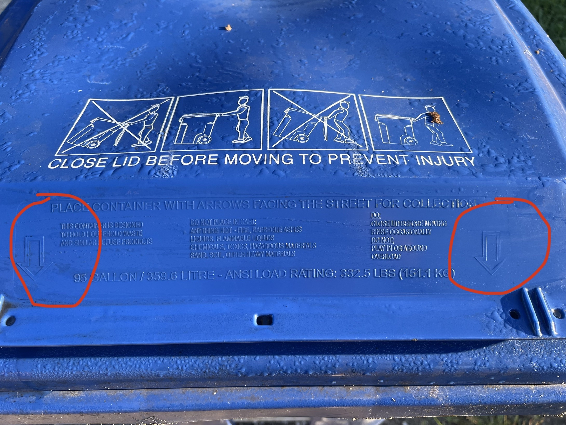 - Carts should open towards the street. Do not place your carts sideways or backwards at the curb. The lids should always open towards the street to prevent damage to the lid/cart. The arrows on the lid should always point toward the street as pictured below.